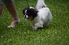 Très belle tête. A ce jour mâchoires correctes. Menton présent. Bonne forme d?yeux + couleur. Pieds de lièvre. Très bonne ligne de dos. Poitrine déjà bien formée. Queue bien attachée. Démarche à travailler, queue assez bien portée.